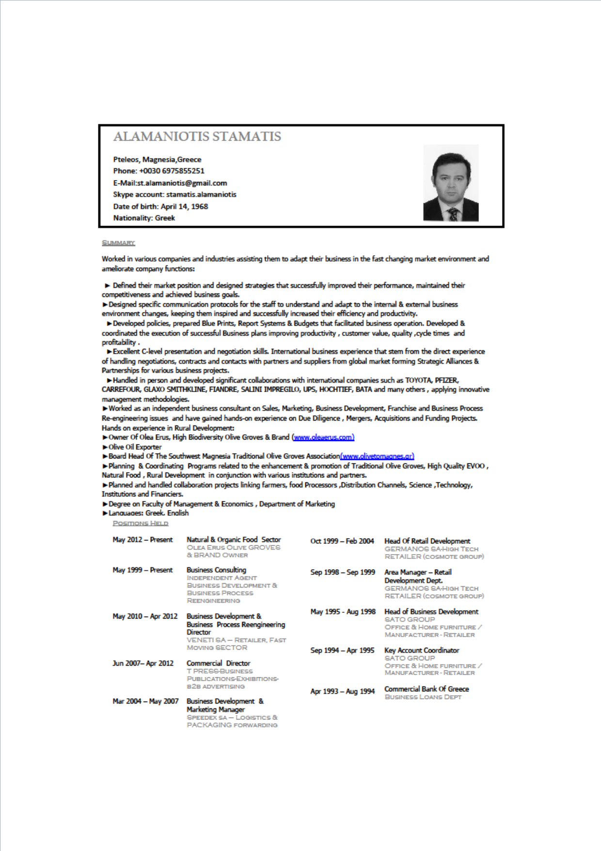 Δεν είμαι ακαδημαϊκός αλλά άνθρωπος του πεδίου με σύνθετη εμπειρία στον ιδιωτικό τομέα και τα τελευταία χρόνια με έντονη δραστηριότητα στον τομέα της ελαιοκομίας, της οργανικής καλλιέργειας και της παραγωγής ελαιοκομικών προϊόντων με έμφαση στις υγειοπροστατευτικές ιδιότητες .Ειμαι ιδρυτικο μέλος του Συνδέσμου Παραδοσιακών Ελαιώνων Νοτιοδυτικής Μαγνησίας με μακροχρόνια ερευνητική δραστηριότητα στα ζητήματα της Οικονομίας της Αγροτικής Υπαίθρου .